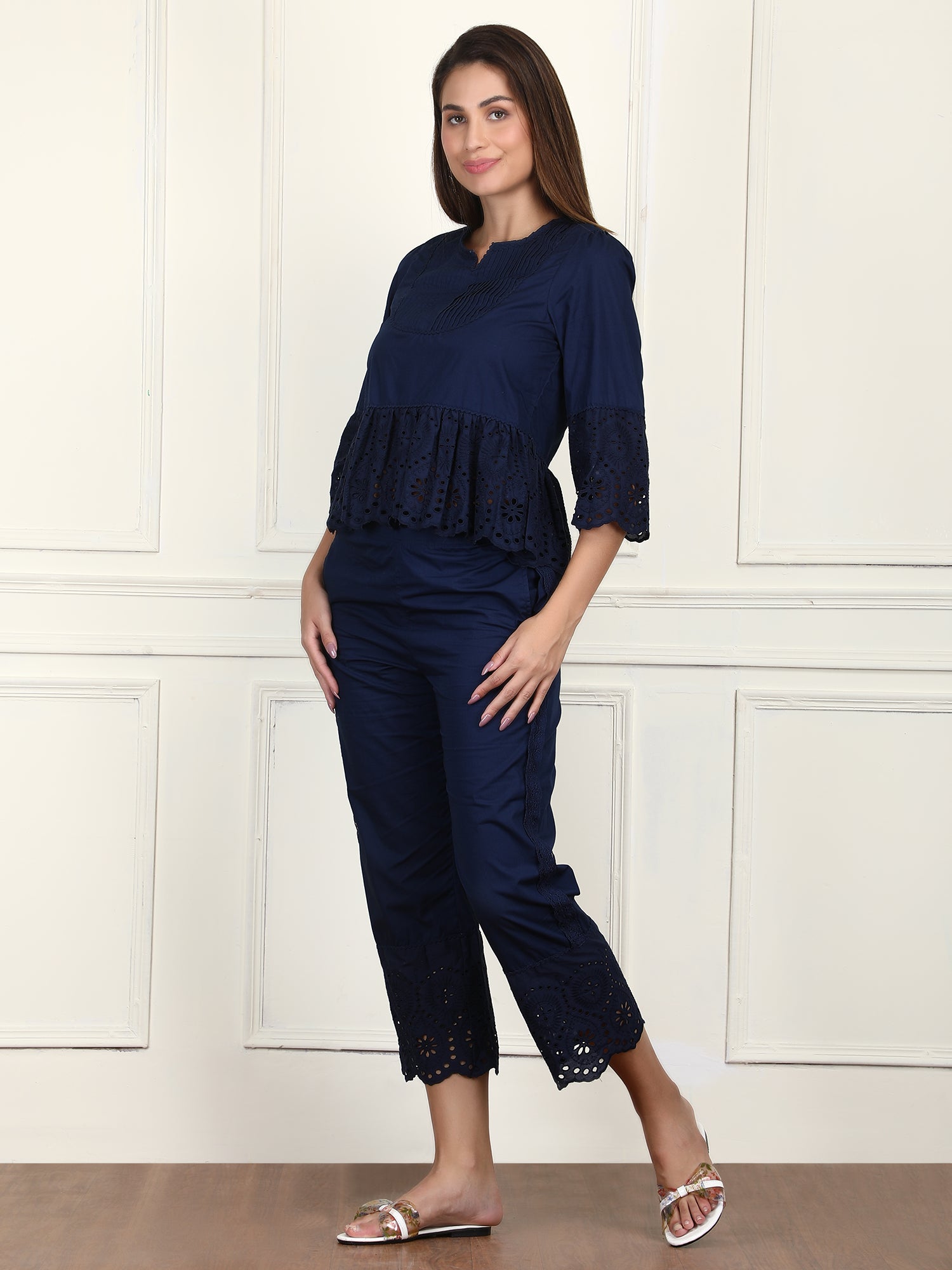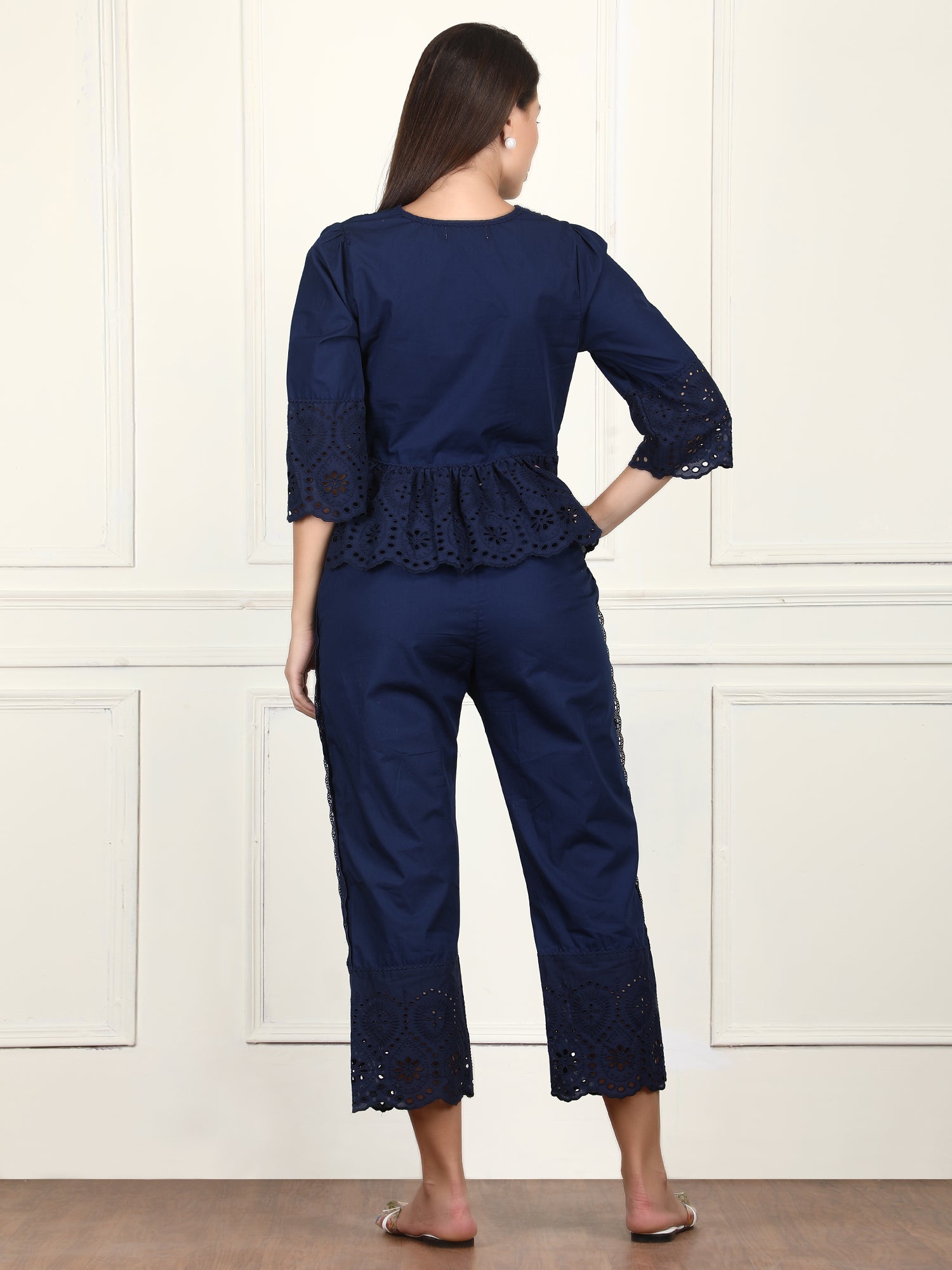 Peplum top made with high quality cotton fabric with cutwork embroidery on the sleeves & ruffled hem adorned with ric rac lace detailing